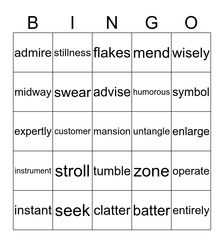 This bingo card has 25 words: stroll, clatter, advise, instant, wisely, admire, midway, stillness, untangle, tumble, humorous, expertly, zone, operate, swear, entirely, enlarge, flakes, symbol, customer, mansion, seek, instrument, mend and batter.
