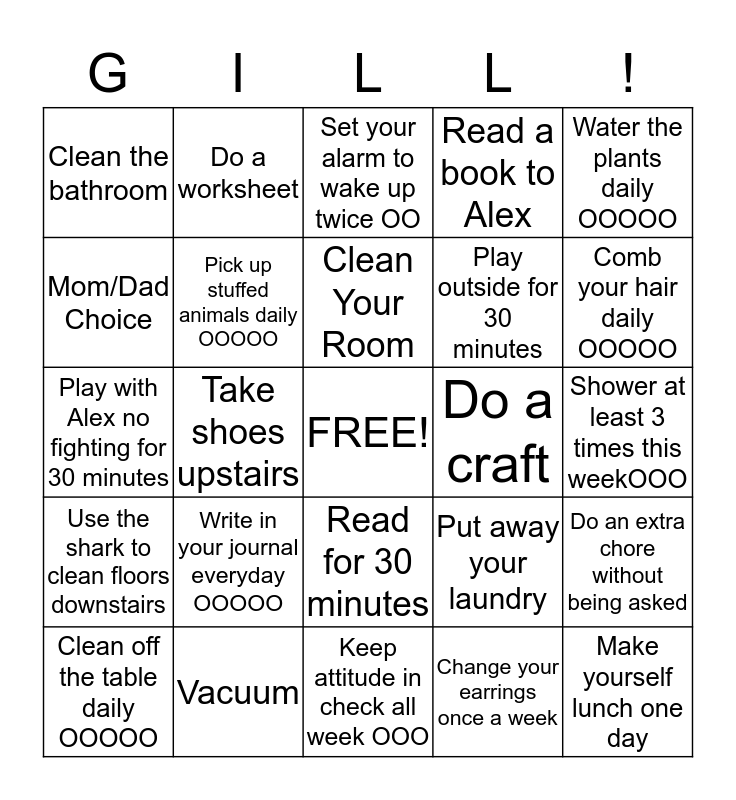 This bingo card has a free space and 24 words: Write in your journal everyday OOOOO, Vacuum, Clean Your Room, Clean off the table daily OOOOO, Water the plants daily OOOOO, Clean the bathroom, Mom/Dad Choice, Do a worksheet, Do a craft, Read for 30 minutes, Play outside for 30 minutes, Play with Alex no fighting for 30 minutes, Put away your laundry, Do an extra chore without being asked, Pick up stuffed animals daily OOOOO, Change your earrings once a week, Shower at least 3 times this weekOOO, Set your alarm to wake up twice OO, Comb your hair daily OOOOO, Take shoes upstairs, Make yourself lunch one day, Use the shark to clean floors downstairs, Read a book to Alex and Keep attitude in check all week OOO.