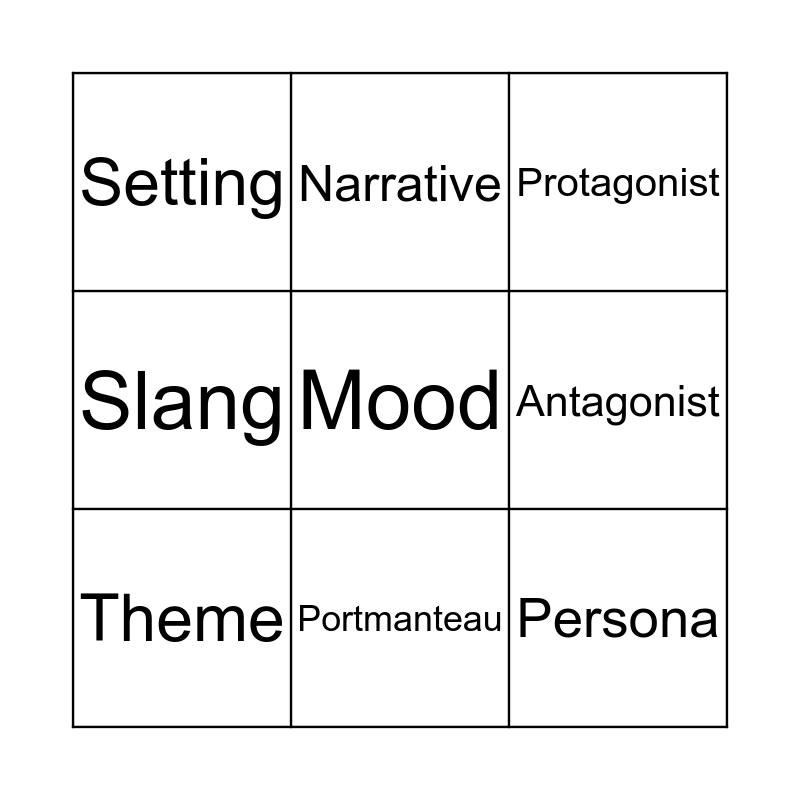 This bingo card has 9 words: Theme, Protagonist, Narrative, Slang, Setting, Antagonist, Mood, Persona and Portmanteau.