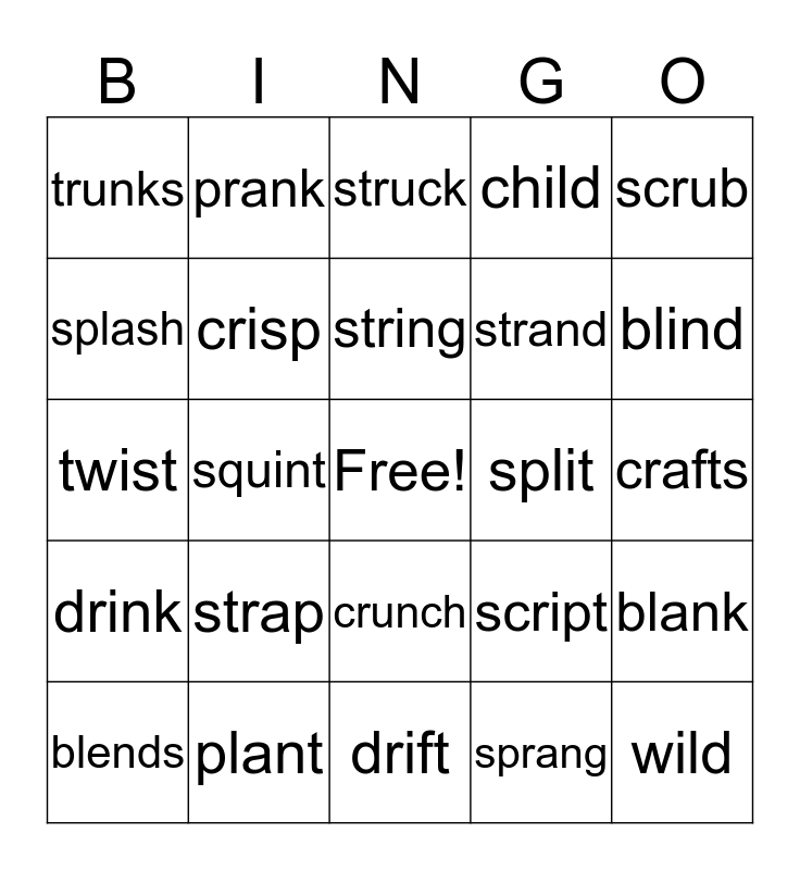 This bingo card has a free space and 24 words: strap, plant, string, blends, scrub, trunks, splash, prank, split, crunch, strand, twist, script, blank, crisp, sprang, crafts, struck, blind, squint, wild, drink, child and drift.
