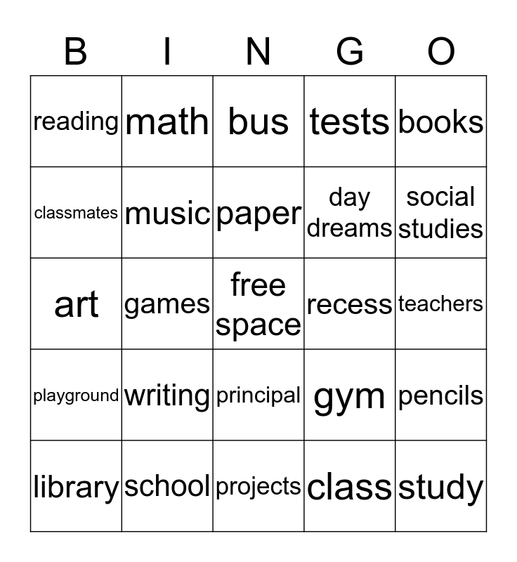 This bingo card has a free space and 24 words: writing, school, paper, library, books, reading, classmates, math, recess, principal, day dreams, art, gym, pencils, music, class, teachers, bus, social studies, games, study, playground, tests and projects.