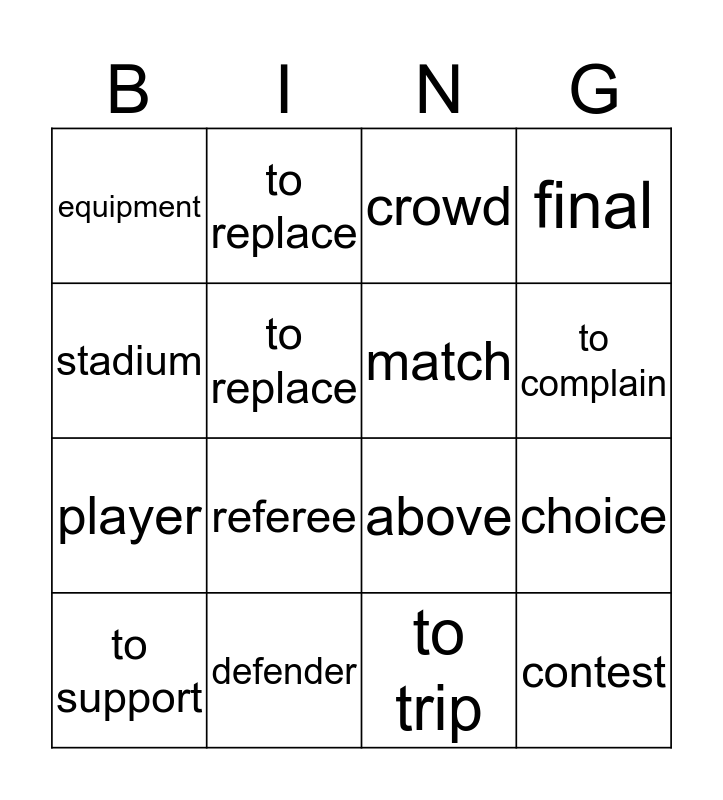 This bingo card has 16 words: defender, choice, crowd, equipment, player, to replace, above, to trip, stadium, to replace, to support, final, referee, to complain, match and contest.