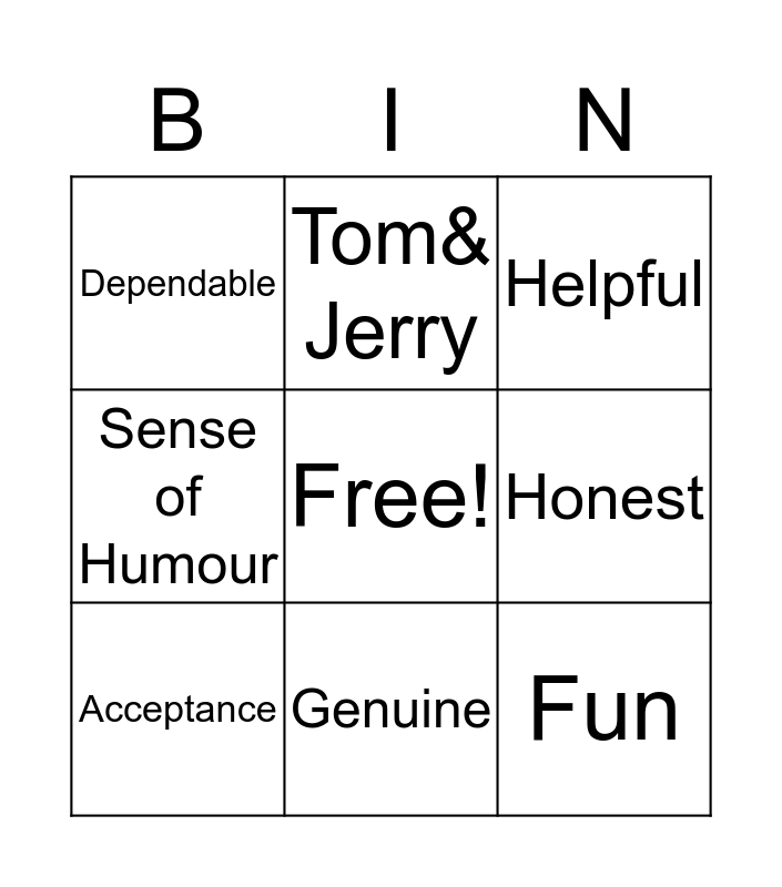 This bingo card has a free space and 20 words: Respectful, Supportive, Helpful, Kind, Trustworthy, Fun, Forgiving, Dependable, Listener, Tom& Jerry, Similar interests, Spongebob & Patrick, Honest, Empathy, Acceptance, Supportive, Genuine, Sense of Humour, Fun and Thoughtful.