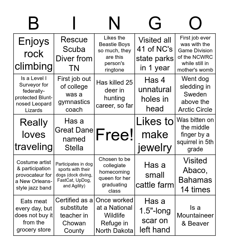This bingo card has a free space and 28 words: Visited Abaco, Bahamas 14 times, Restored & owns 2 classic cars, Has 4 unnatural holes in head, Has a 1.5"-long scar on left hand, Is a Level I Surveyor for federally-protected Blunt-nosed Leopard Lizards, Likes the Beastie Boys so much, they are this person's ringtone, Rescue Scuba Diver from TN, Costume artist & participation provocateur for a New Orleans-style jazz band, Likes to make jewelry, Eats meat every day, but does not buy it from the grocery store, Really loves traveling, Visited all 41 of NC's state parks in 1 year, Certified as a substitute teacher in Chowan County, Once worked at a National Wildlife Refuge in North Dakota, Went dog sledding in Sweden above the Arctic Circle, Enjoys picking wild leeks in PA with family during the spring, Participates in dog sports with their dogs (dock diving, FastCat, UpDog, and Agility), First job out of college was a gymnastics coach, Has killed 25 deer in hunting career, so far, Chosen to be collegiate homecoming queen for her graduating class, Enjoys rock climbing, Spent a year in South Florida as a farmer growing vegetables for commercial agriculture, Is a Mountaineer & Beaver, Has a Great Dane named Stella, Was bitten on the middle finger by a squirrel in 5th grade, Has a small cattle farm, First job ever was with the Game Division of the NCWRC while still in mother's womb and Was a certified welder for 4 years, 2 years of which were spent in robotics welding.