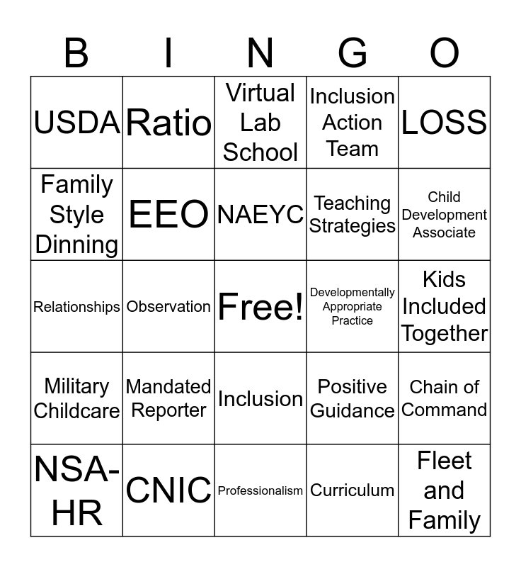 This bingo card has a free space and 24 words: Mandated Reporter, CNIC, NAEYC, NSA-HR, LOSS, USDA, Family Style Dinning, Ratio, Developmentally Appropriate Practice, Inclusion, Teaching Strategies, Relationships, Positive Guidance, Chain of Command, EEO, Curriculum, Kids Included Together, Virtual Lab School, Child Development Associate, Observation, Fleet and Family, Military Childcare, Inclusion Action Team and Professionalism.
