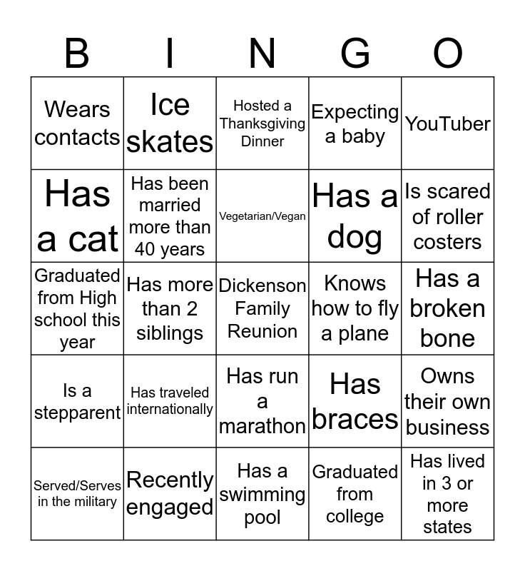 This bingo card has a free space and 43 words: Squares, Has lived in 3 or more states, Is left handed, Served/Serves in the military, Born in Jan, Feb, March, April, May, June, July, August, Sept, Oct, Nov, Dec., Graduated from college, Hosted a Thanksgiving Dinner, Can sing, YouTuber, Recently engaged, Expecting a baby, Knows how to fly a plane, Has run a marathon, Has traveled internationally, Is a grandparent, Has a swimming pool, Knows how to ski, Graduated from High school this year, Is in college, Is scared of roller costers, Ice skates, Eats Sushi, Wears glasses, Wears contacts, Loves the Beach, Has a broken bone, Plays Baseball, Plays Football, Has braces, Is a stepparent, Plays video game, Owns their own business, Is in high school, Has more than 2 siblings, Is the youngest child, Is the oldest child, Owns/Rides horses, Vegetarian/Vegan, Has a cat, Has a dog, Plays basketball, Has been married more than 40 years and Loves to cook.
