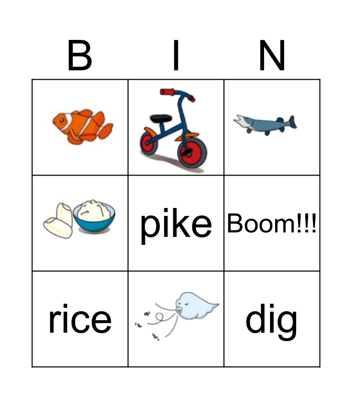 This bingo card has 9 images and 9 words: dig, in, pike, fish, Boom!!!, rice, ride, bike and wind.