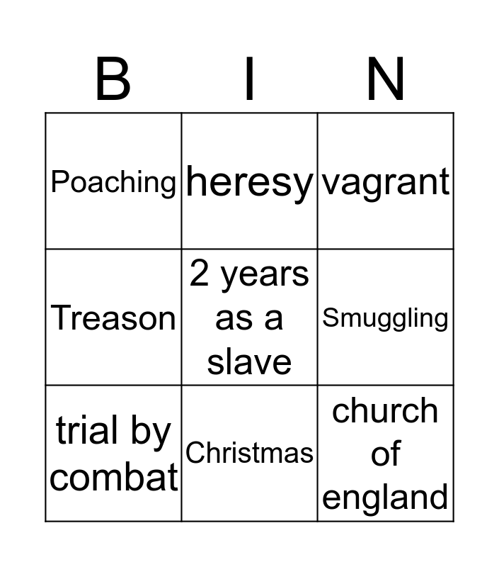 This bingo card has 9 words: trial by combat, vagrant, heresy, Treason, Poaching, Smuggling, 2 years as a slave, church of england and Christmas.