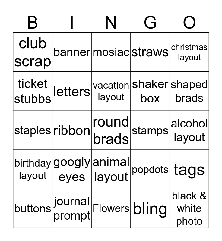 This bingo card has a free space and 29 words: buttons, charms, ribbon, cricut image, club scrap, mosiac, letters, googly eyes, stamps, journal prompt, alcohol layout, black & white photo, Flowers, bling, shaped brads, stencils, animal layout, birthday layout, christmas layout, staples, popdots, twine, shaker box, ticket stubbs, straws, banner, tags, vacation layout and paper punches.