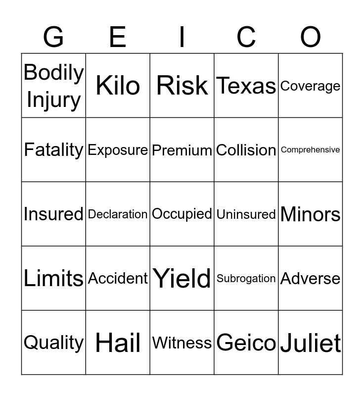 This bingo card has a free space and 24 words: Accident, Hail, Premium, Quality, Coverage, Bodily Injury, Fatality, Kilo, Uninsured, Yield, Collision, Insured, Subrogation, Adverse, Exposure, Geico, Minors, Risk, Comprehensive, Declaration, Juliet, Limits, Texas and Witness.