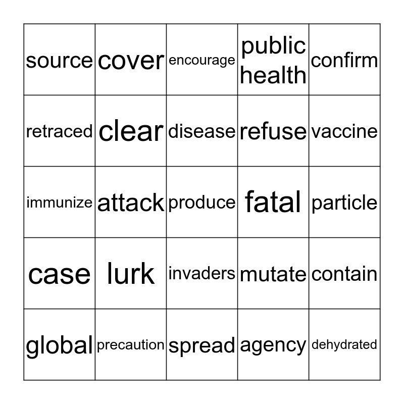 This bingo card has 32 words: agency, approved, attack, bacteria, case, clear, confirm, contain, cover, dehydrated, disease, encourage, epidemiologist, examine, fatal, foreign, global, immunize, invaders, lurk, mutate, obvious, particle, precaution, produce, public health, refuse, retraced, source, spread, treat and vaccine.