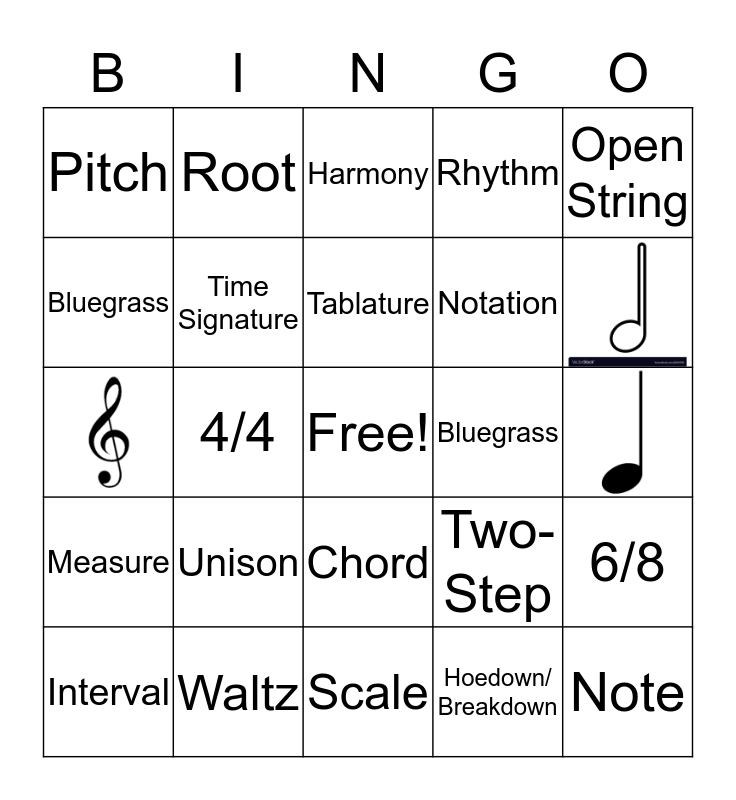This bingo card has 7 images, a free space and 27 words: Hoedown/ Breakdown, Tempo, Measure, Time Signature, Open String, Interval, Root, Intonation, Tablature, Harmony, Tone, Bluegrass, Waltz, Unison, Two-Step, Chord, Pitch, Scale, Note, Rhythm, Measure, Notation, Bluegrass, 3/4, 4/4, 6/8 and 2/4.