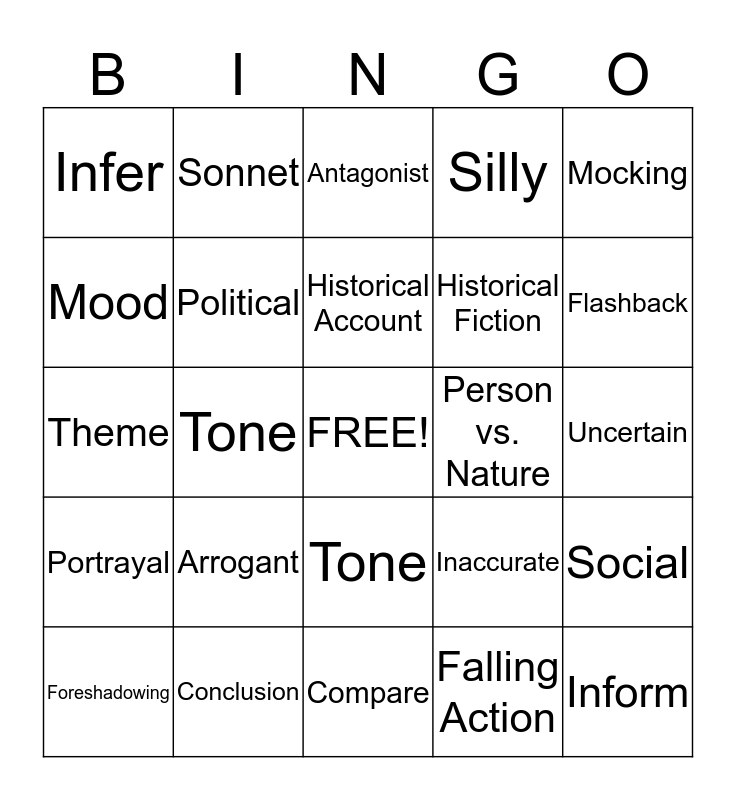 This bingo card has a free space and 68 words: Hopeful, Inform, Entertain, Persuade, Thesis, Connotation, Sonnet, Exemplar, Historical Account, Repetition, Tone, Epic Poem, Uncertain, Mocking, Anxious, Mood, Tone, Infer, Draw a Conclusion, Arrogant, Historical Fiction, Inaccurate, Portrayal, 1st Person Point of View, 3rd Person Point of View, Gloomy, Mocking, Sympathetic, Social, Protagonist, Antagonist, Explain, Distinguish, Point of View or, Silly, Distressed, Peaceful, Foreshadowing, Flashback, Theme, Perspective, Inference, Political, Author’s Position, Tone, Advantages, Drawbacks, Person vs. Society, Person vs. Nature, Conclusion, Topic Sentence, Author’s Purpose, Characterization, Compare, Contrast, Rising Action, Falling Action, Exposition, Internal Conflict, Couplet, Resolution, Climax, External Conflict, Person vs. Person, Person vs. Self, Restate, Answer and Cite.