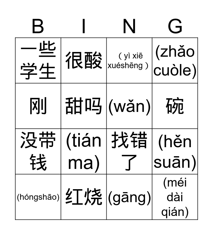 This bingo card has 24 words: Free!, 放, 碗, 白菜, 刚, 一些学生, 甜吗, 很酸, 红烧, 鱼, 没带钱, 找错了, 没看清楚, (fàng), (wǎn), (báicài), (gāng), (yì xiē xuéshēng), (tián ma), (hěn suān), (hóngshāo), (méi dài qián), (zhǎo cuòle) and (méi kàn qīngchǔ).