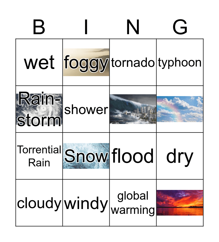 This bingo card has 6 images and 13 words: cloudy, windy, tornado, typhoon, Rain-storm, foggy, flood, dry, wet, shower, global warming, Torrential Rain and Snow.