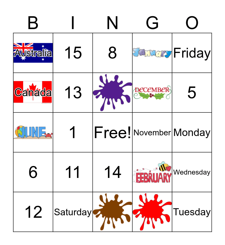 This bingo card has 21 images, a free space and 37 words: America, 11, Monday, Ireland, 15, Tuesday, Canada, 18, Wednesday, England, 20, Thursday, Australia, 1, Friday, 2, 3, 4, 5, 6, 7, 8, 9, 10, 12, 13, 14, 16, 17, 19, South Africa, May, November, October, September, Saturday and Sunday.