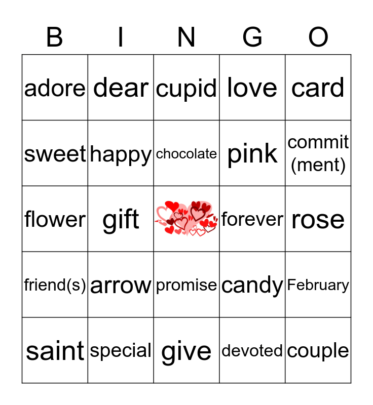 This bingo card has a free space and 27 words: heart(s), special, chocolate, devoted, card, sweet, dear, give, forever, February, friend(s), happy, candy, couple, flower, red, cupid, love, rose, adore, arrow, promise, pink, commit (ment), saint, gift and hug.