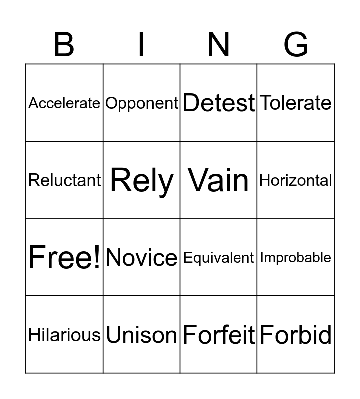 This bingo card has 20 words: Improbable, Vow, Detest, Omit, Hilarious, Reluctant, Unison, Accelerate, Free!, Opponent, Novice, Equivalent, Rely, Forbid, Vain, Declare, Horizontal, Tolerate, Forfeit and Tangible.