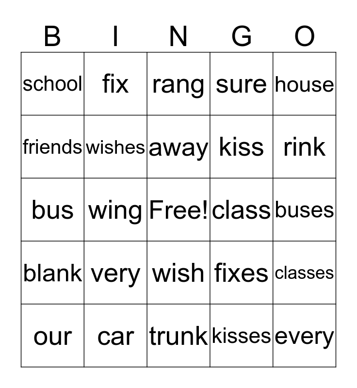 This bingo card has a free space and 24 words: very, car, away, our, house, school, friends, fix, class, wish, kiss, bus, fixes, classes, wishes, kisses, buses, rang, rink, wing, every, blank, sure and trunk.