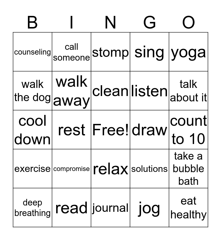 This bingo card has a free space and 29 words: deep breathing, yell, rest, meditate, counseling, stomp, walk away, compromise, draw, read, count to 10, eat healthy, journal, jog, talk about it, respect, relax, exercise, yoga, cool down, solutions, music, listen, walk the dog, sing, call someone, take a bubble bath, clean and pray.