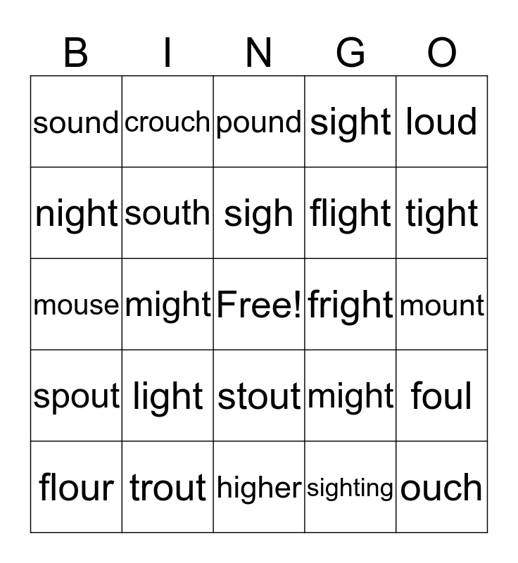 This bingo card has a free space and 29 words: flour, lighting, might, scout, sound, pound, south, light, fright, trout, mount, ouch, higher, sighting, tight, mouth, stout, spout, loud, mouse, might, joust, flight, night, sight, crouch, foul, sigh and high.