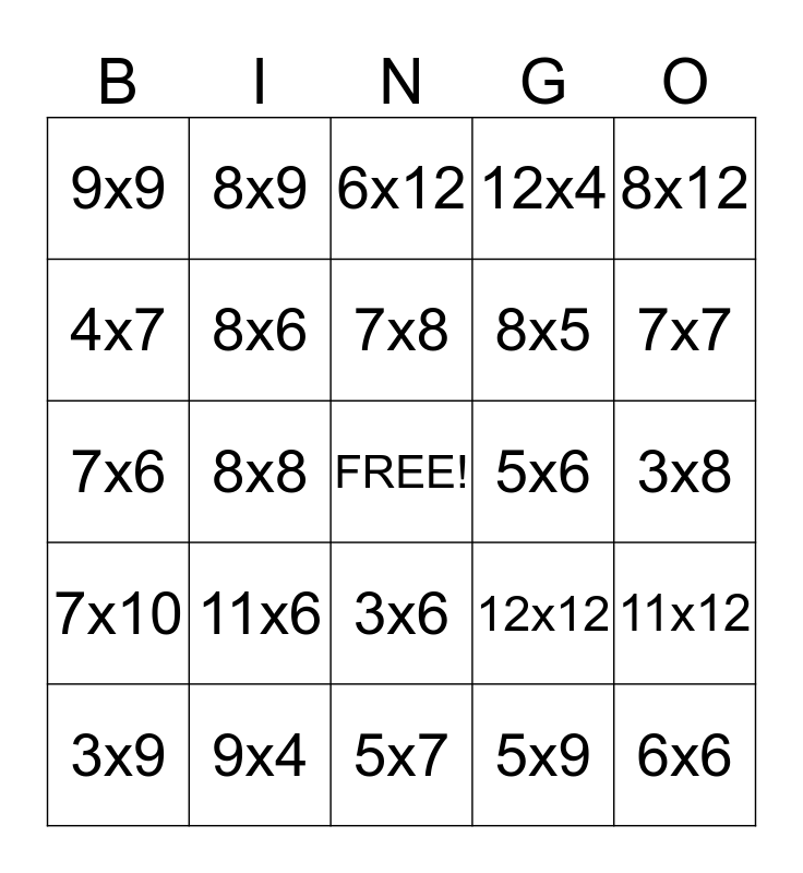 This bingo card has a free space and 24 words: 11x6, 9x4, 7x8, 3x9, 8x12, 9x9, 4x7, 8x9, 5x6, 3x6, 8x5, 7x6, 12x12, 11x12, 8x6, 5x9, 3x8, 6x12, 7x7, 8x8, 6x6, 7x10, 12x4 and 5x7.
