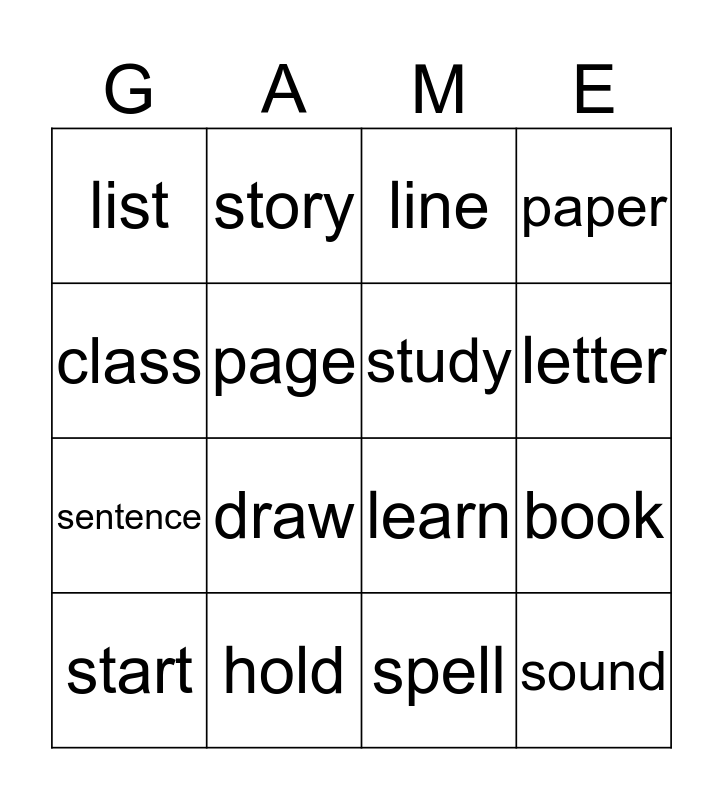 This bingo card has 20 words: book, front, line, picture, start, class, hold, list, sentence, story, draw, learn, page, sound, study, end, letter, paper, spell and word.