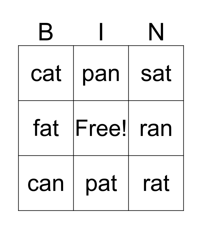 This bingo card has a free space and 11 words: fan, pat, rat, can, pan, sat, ran, hat, fat, cat and ban.