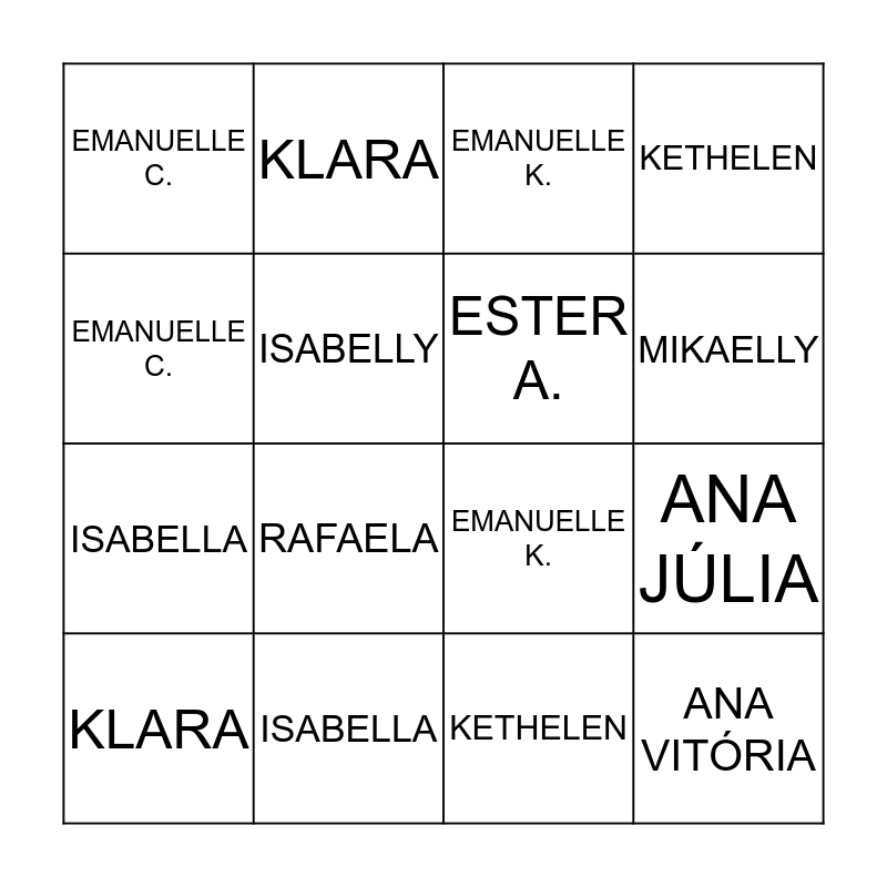⚠ This card has duplicate items: ALICE (2), ANA JÚLIA (2), ANA VITÓRIA (2), EMANUELLE C. (2), EMANUELLE K. (2), ESTER A. (2), ISABELLA (2), ISABELLY (2), KETHELEN (2), KLARA (2), LARISSA (2), MIKAELLY (2), RAFAELA (2)