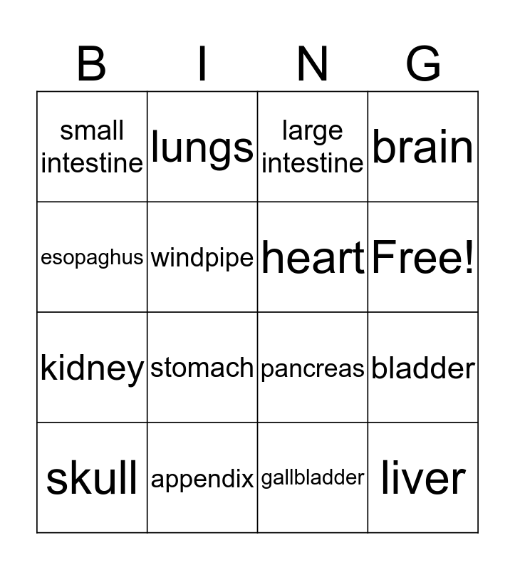 This bingo card has 18 words: stomach, liver, large intestine, small intestine, pancreas, brain, skull, lungs, Free!, kidney, gallbladder, esopaghus, bladder, windpipe, heart, spleen, appendix and diaphragm.
