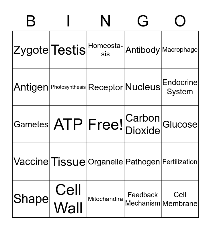 This bingo card has a free space and 29 words: Shape, Fallopian Tube, ATP, Uterus, Zygote, Homeosta-sis, Photosynthesis, Tissue, Carbon Dioxide, Cell Wall, Glucose, Cell Membrane, Mitochandira, Feedback Mechanism, Endocrine System, Circulatory System, Organelle, Vaccine, Macrophage, Gametes, Pathogen, Small Intestine, Nucleus, Antigen, Antibody, Testis, Fertilization, Receptor and Insulin.
