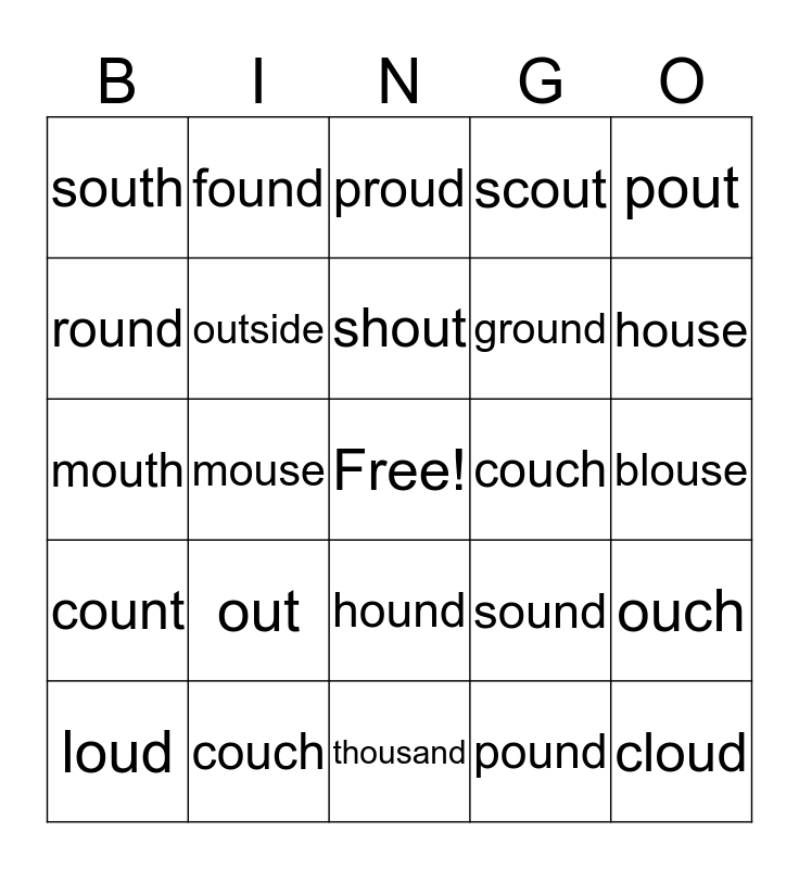 This bingo card has a free space and 24 words: out, couch, shout, loud, pout, south, round, found, couch, hound, ground, mouth, sound, ouch, outside, pound, blouse, proud, house, mouse, cloud, count, scout and thousand.