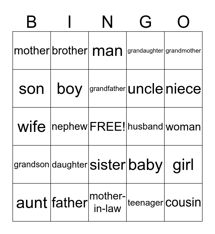 This bingo card has a free space and 24 words: daughter, father, grandfather, aunt, grandmother, mother, son, brother, husband, sister, uncle, wife, baby, girl, boy, teenager, woman, man, niece, nephew, cousin, grandson, grandaughter and mother-in-law.