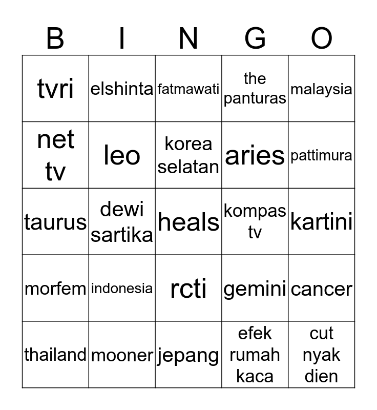 This bingo card has 25 words: indonesia, jepang, korea selatan, thailand, malaysia, tvri, net tv, elshinta, kompas tv, rcti, aries, taurus, gemini, cancer, leo, cut nyak dien, kartini, fatmawati, pattimura, dewi sartika, heals, mooner, morfem, the panturas and efek rumah kaca.