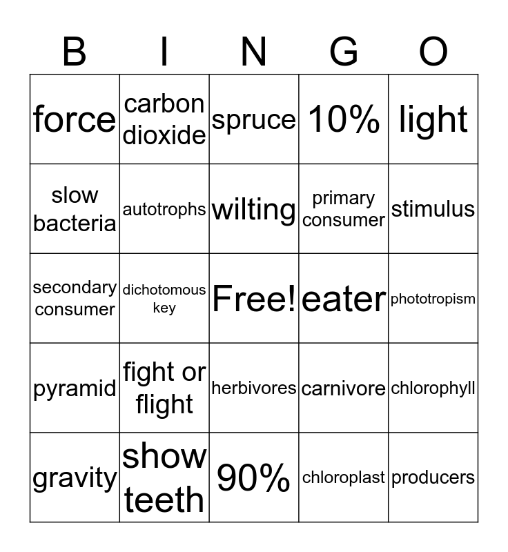 This bingo card has a free space and 24 words: fight or flight, show teeth, wilting, gravity, light, force, slow bacteria, carbon dioxide, eater, herbivores, primary consumer, secondary consumer, carnivore, chlorophyll, autotrophs, chloroplast, phototropism, spruce, stimulus, dichotomous key, producers, pyramid, 10% and 90%.