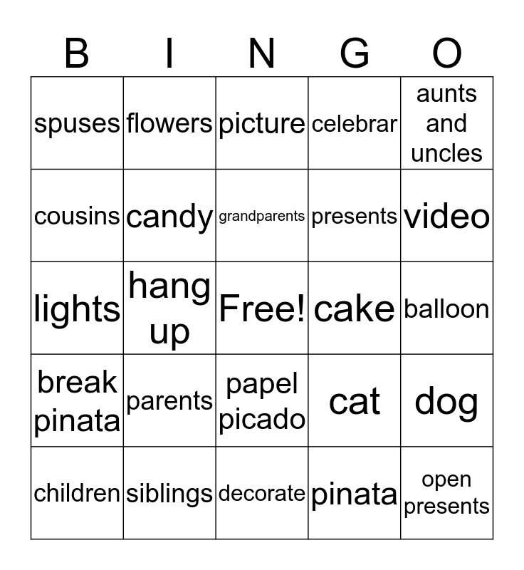 This bingo card has a free space and 24 words: parents, siblings, grandparents, children, aunts and uncles, spuses, cousins, flowers, cake, papel picado, presents, lights, cat, dog, candy, pinata, balloon, picture, video, hang up, open presents, break pinata, celebrar and decorate.
