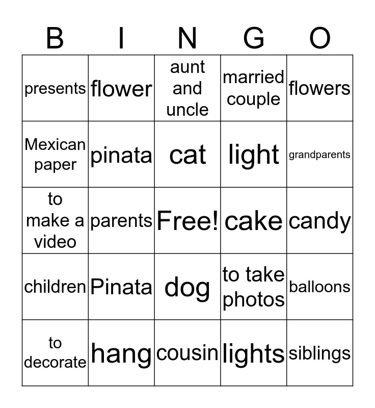 This bingo card has a free space and 24 words: Pinata, hang, cat, to decorate, flowers, presents, Mexican paper, flower, cake, dog, light, to make a video, to take photos, balloons, pinata, lights, candy, aunt and uncle, grandparents, parents, siblings, children, married couple and cousin.