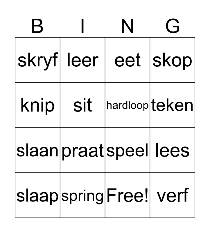 This bingo card has 17 words: Free!, slaap, eet, skryf, praat, skop, lees, hardloop, teken, sit, spring, speel, knip, leer, slaan, gooi and verf.