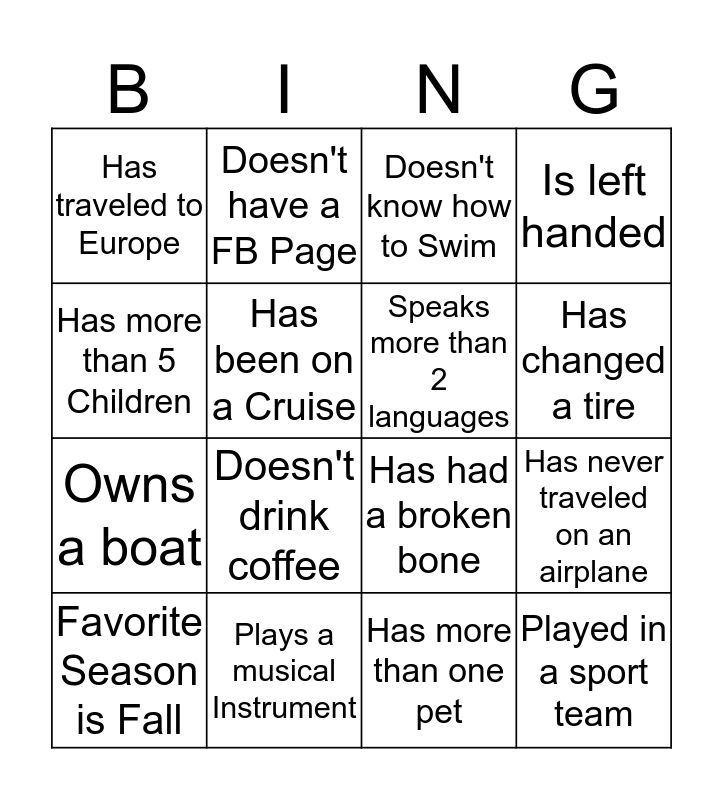 This bingo card has 21 words: Plays a musical Instrument, Is a NFL Dallas Cowboy Fan, Doesn't have a FB Page, Born in another Country, Has more than one pet, Speaks more than 2 languages, Has traveled to Europe, Doesn't know how to Swim, Has had a broken bone, Has changed a tire, Owns a boat, Is left handed, Played in a sport team, Has met a celebrity, Has been on a Cruise, Loves Chocolate, Favorite Season is Fall, Doesn't drink coffee, Has more than 5 Children, Has never traveled on an airplane and Born in February.