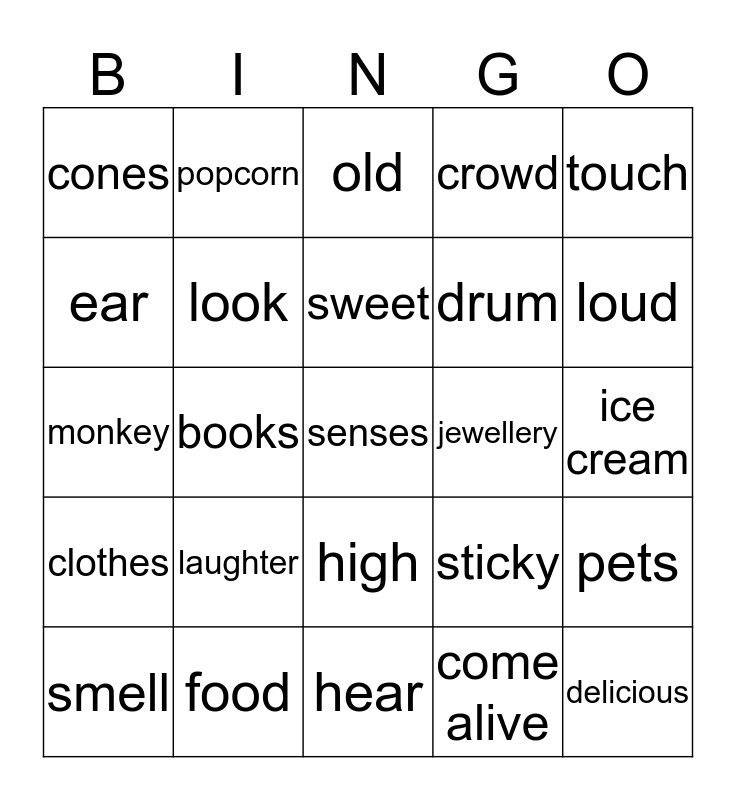 This bingo card has a free space and 24 words: laughter, food, sweet, smell, touch, cones, ear, popcorn, jewellery, high, drum, monkey, sticky, pets, look, come alive, ice cream, old, loud, books, delicious, clothes, crowd and hear.