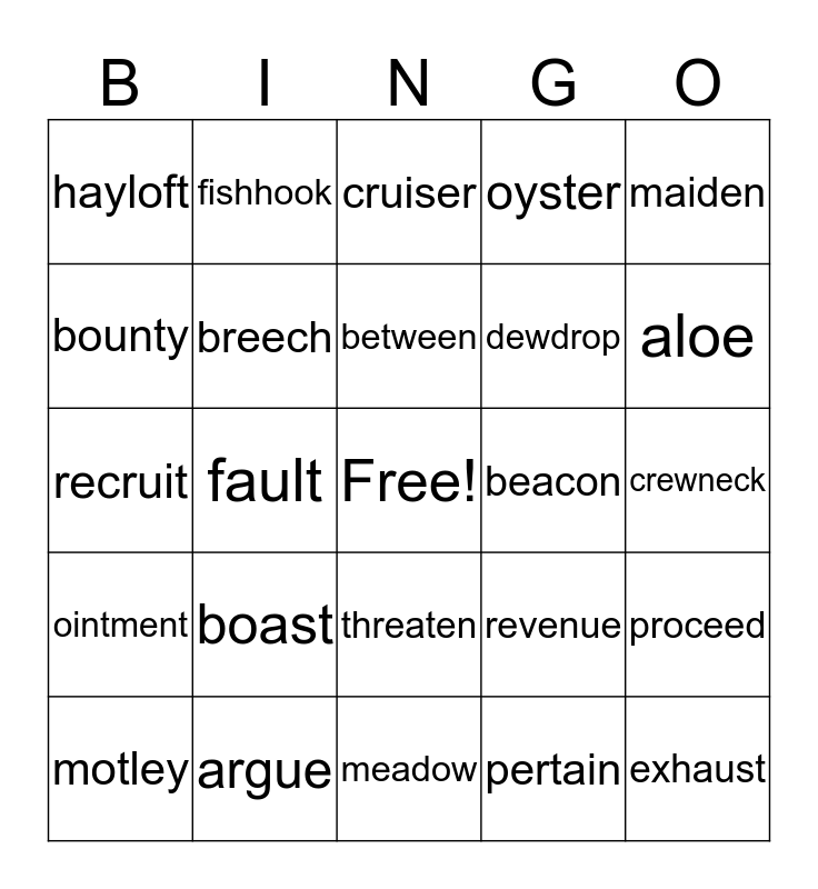 This bingo card has a free space and 24 words: boast, argue, between, motley, maiden, hayloft, bounty, fishhook, beacon, threaten, dewdrop, recruit, revenue, proceed, breech, pertain, crewneck, cruiser, aloe, fault, exhaust, ointment, oyster and meadow.