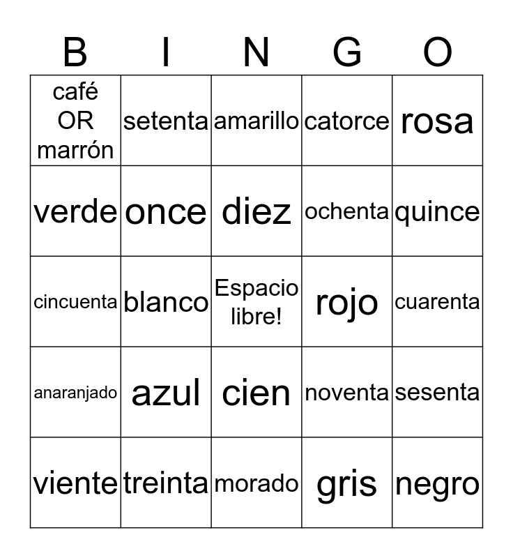 This bingo card has a free space and 24 words: azul, treinta, diez, viente, rosa, café OR marrón, verde, setenta, rojo, cien, ochenta, cincuenta, noventa, sesenta, once, gris, cuarenta, amarillo, quince, blanco, negro, anaranjado, catorce and morado.