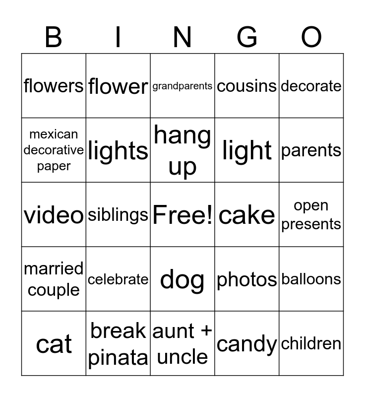This bingo card has a free space and 24 words: celebrate, break pinata, hang up, cat, decorate, flowers, mexican decorative paper, flower, cake, dog, light, video, photos, balloons, lights, candy, open presents, grandparents, parents, siblings, children, married couple, cousins and aunt + uncle.