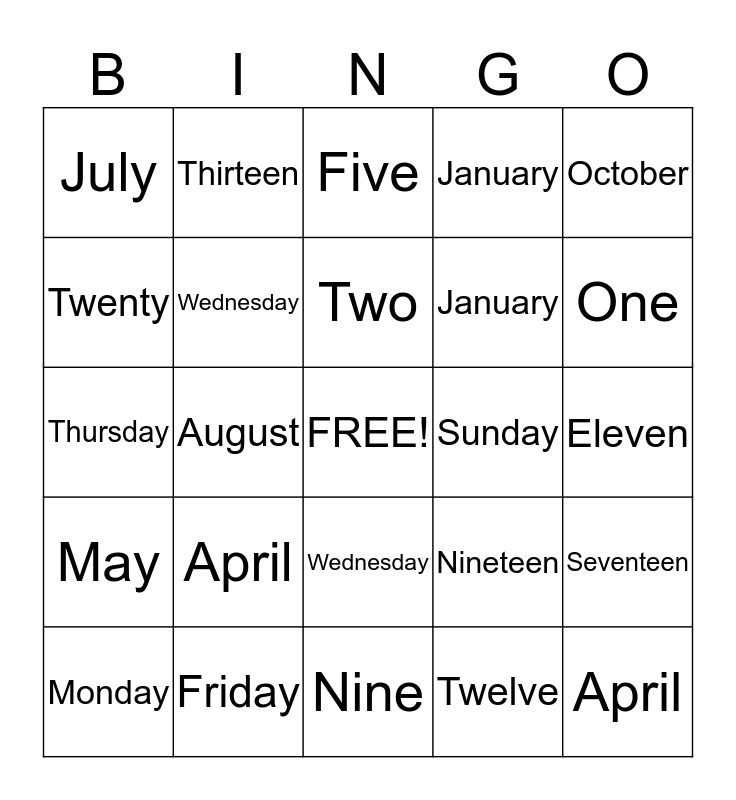This bingo card has a free space and 24 words: April, Friday, Two, Monday, October, July, Twenty, Thirteen, Sunday, Wednesday, January, Thursday, Nineteen, Seventeen, Wednesday, Twelve, Eleven, Five, One, August, April, May, January and Nine.