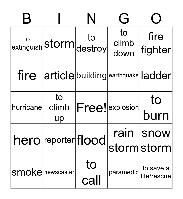 This bingo card has a free space and 24 words: reporter, newscaster, building, smoke, fire fighter, to extinguish, fire, storm, explosion, flood, earthquake, hurricane, rain storm, snow storm, article, paramedic, to burn, to destroy, ladder, to climb up, to save a life/rescue, hero, to climb down and to call.