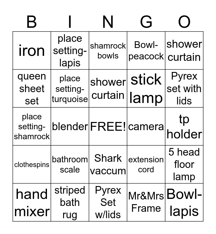 This bingo card has a free space and 74 words: peacock place setting, sponge, shamrock bowls, clock, spoon rest, old fashion glasses, blue kitchen towels, stand up mirror, hand mixer, Mr & Mrs frame, memory foam bath rug, toaster, shower curtain, queen sheet set, bowl set, blender, picnic basket, Pyrex set with lids, oven mitt, place setting-shamrock, place setting-turquoise, place setting-lapis, Bowl-peacock, Bowl-turquoise, Bowl-lapis, Gray kitchen towels, kitchen sponge, bowl set, glasses set, old fashion glasses, shower curtain, sheet set, stand mirror, K-cup variety pack, hand mixer, Mr&Mrs Frame, memory foam bath rug, toaster, blender, picnic basket, Pyrex Set w/lids, striped bath rug, dish cloth, oven mitt, bath towel - denim, iron, memory foam pillows, bathroom scale, shower caddy, soap dish, wastebasket, tablecloth, tp holder, aqua pillow, tea kettle, kitchen shears, Shark vaccum, steel chair, torch lamp, 5 head floor lamp, stick lamp, ironing board, clothespins, clothes hamper, camera, memory card, lounger, tv tray, extension cord, Brita pitcher, step stool, bookcase, Swiffer Starter kit and wall hooks.