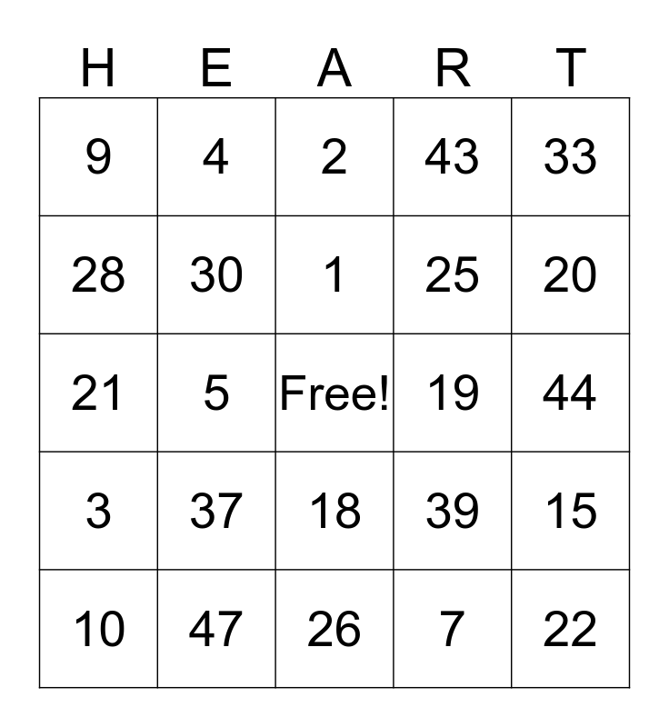 This bingo card has a free space and 24 words: 37, 47, 1, 10, 33, 9, 28, 4, 19, 18, 25, 21, 39, 15, 30, 7, 44, 2, 20, 5, 22, 3, 43 and 26.