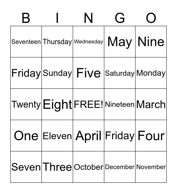 This bingo card has a free space and 24 words: Eleven, Three, Five, Seven, Nine, Seventeen, Friday, Thursday, Nineteen, April, Saturday, Twenty, Friday, Four, Sunday, December, March, Wednesday, Monday, Eight, November, One, May and October.