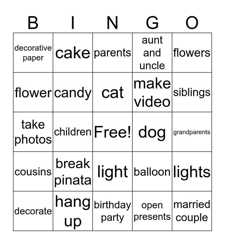This bingo card has a free space and 24 words: break pinata, hang up, cat, decorate, flowers, decorative paper, flower, cake, dog, light, make video, take photos, balloon, lights, candy, open presents, grandparents, parents, siblings, children, married couple, cousins, aunt and uncle and birthday party.