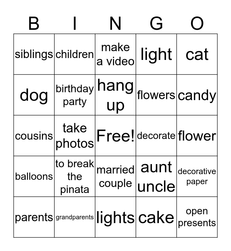 This bingo card has a free space and 24 words: to break the pinata, grandparents, hang up, parents, cat, siblings, dog, children, decorate, married couple, flowers, cousins, aunt uncle, decorative paper, birthday party, cake, flower, make a video, candy, take photos, open presents, balloons, light and lights.